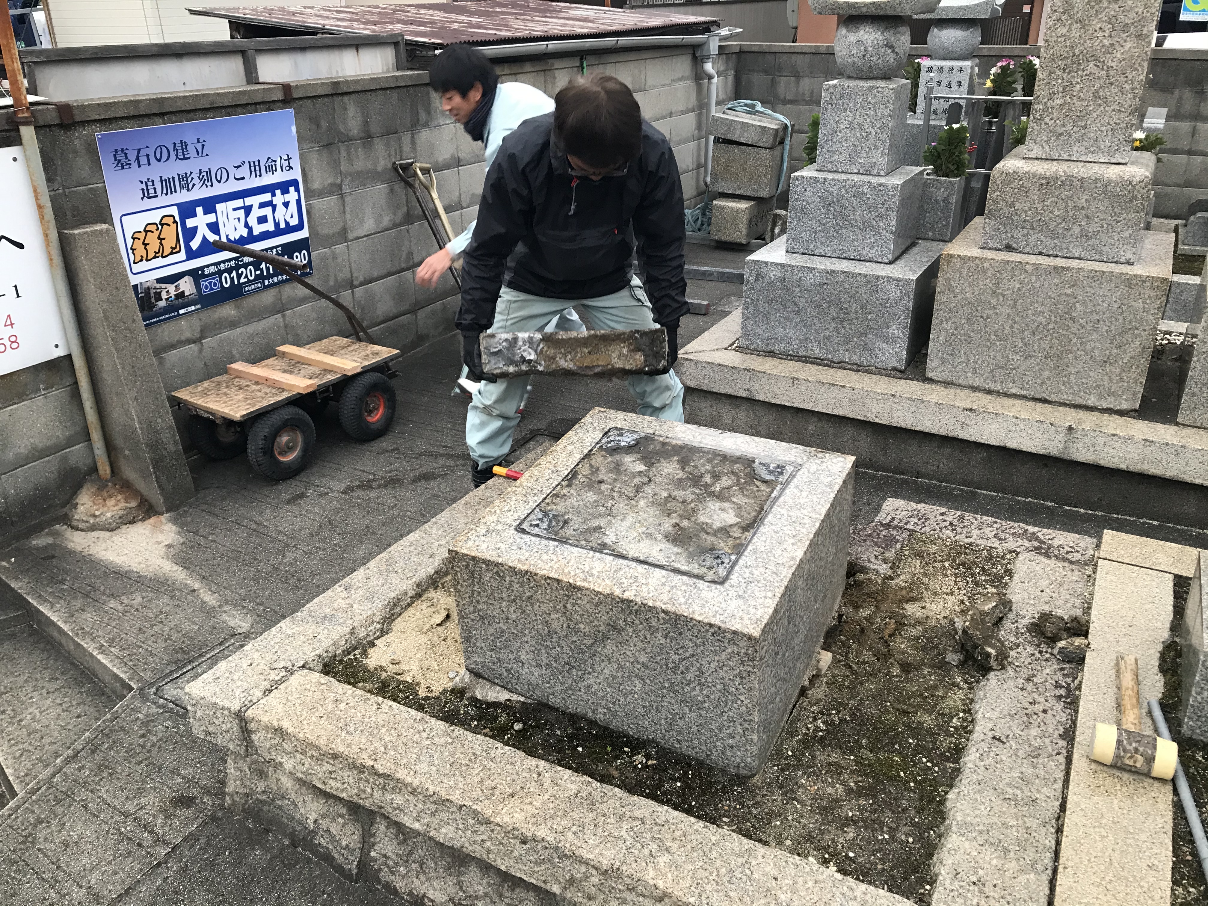 お墓の魂抜きの法要は既に終わって上で、解体をします。今あるお墓を解体撤去して、一度お遺骨を取り出した後、新しいお墓に建てかわります。
