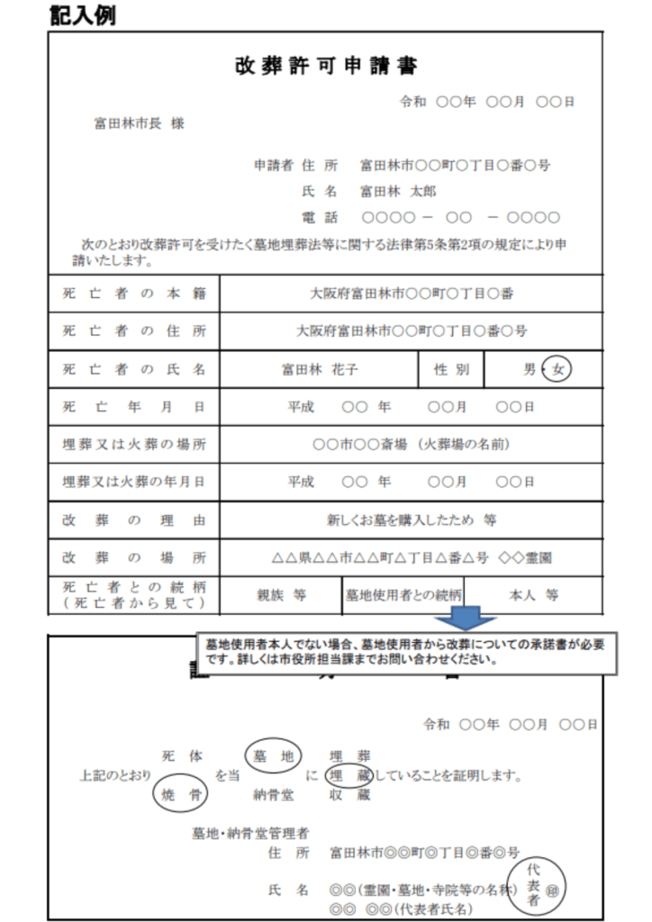 改葬許可は「現在お骨が埋蔵されている市町村」が起点となりますので、富田林霊園の場合は原則富田林市役所で手続きを行う事となります。