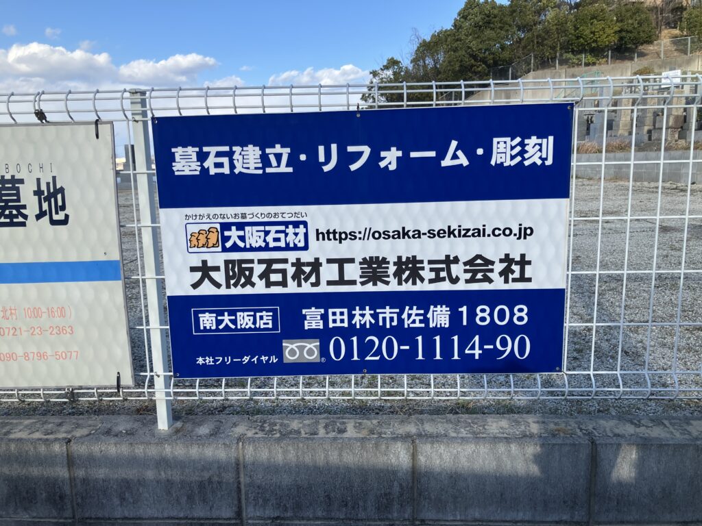 墓地管理委員会の方々から信頼いただいていることもあり墓地内に大阪石材の看板を掲示させていただいております。