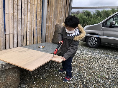 インフルエンザ明けの長男を連れ出し、穴を掘ったりベニヤを切ったり。