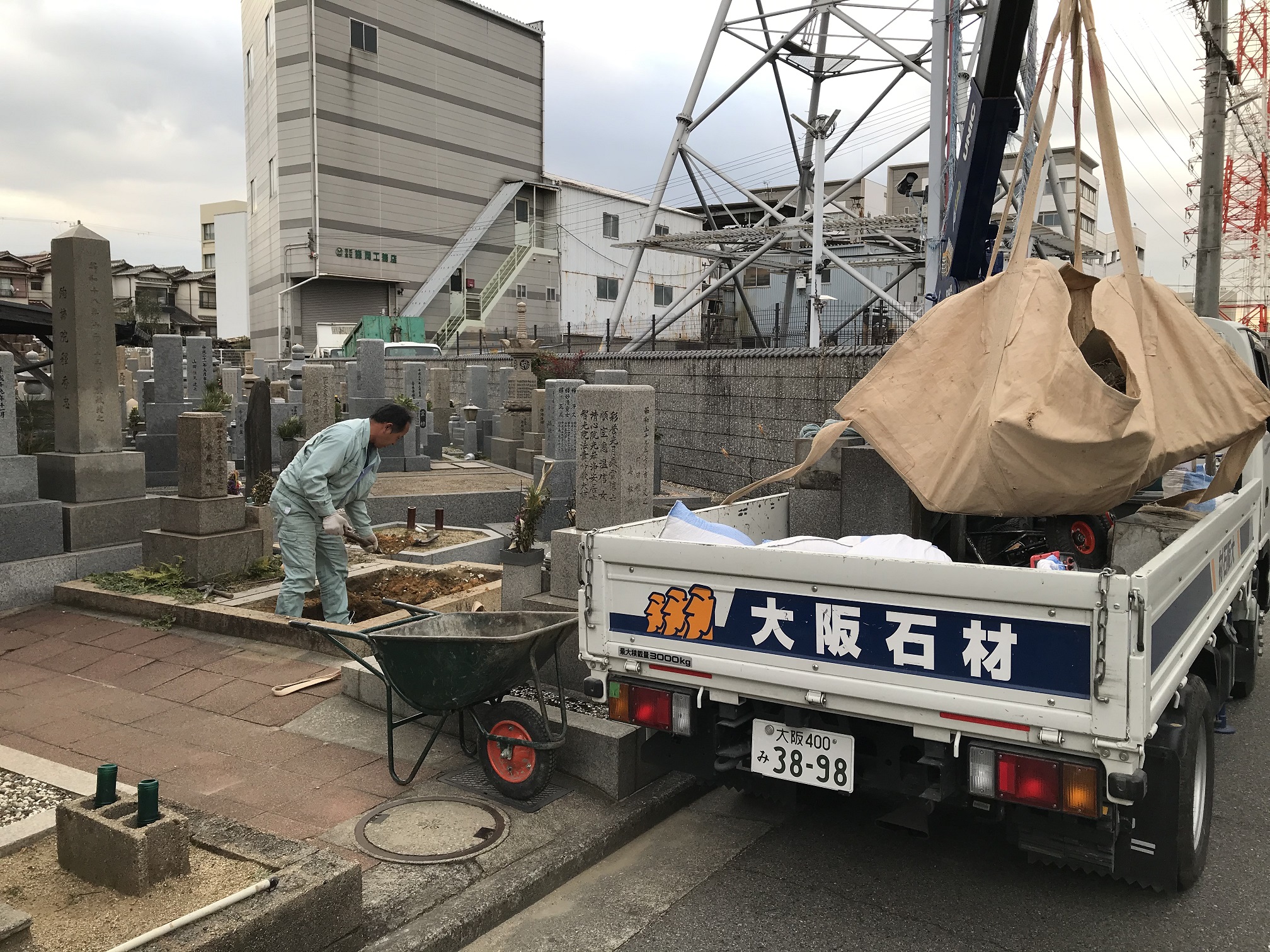 朝から、墓地の正面にトラックをドーンとつけさせて頂きまして、工事をしていきます。