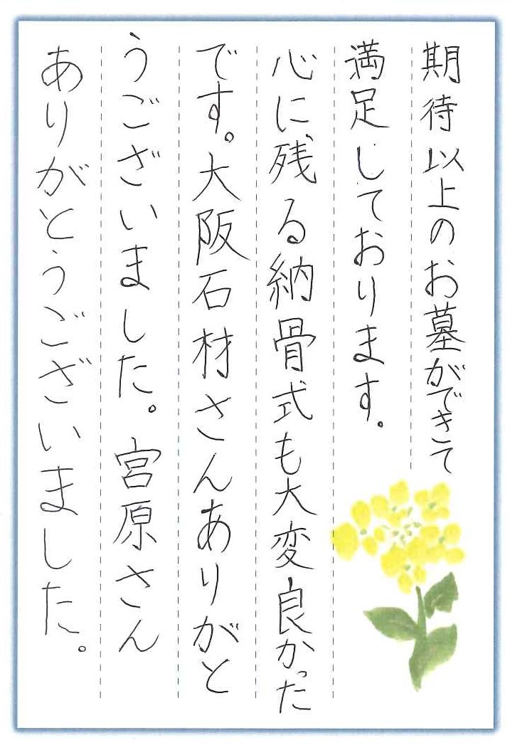 心に残る納骨式も大変良かったです。大阪石材さんありがとうございました。